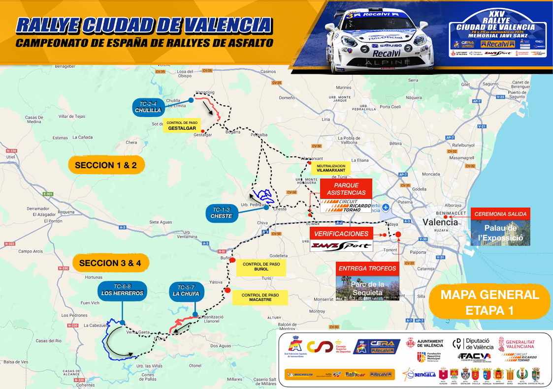 1ª Sección: Comenzará con la Salida del Rallye del primer participante a las 7:30h desde el Circuit Ricardo Tormo en Cheste. A continuación realizarán el primer tramo, un tramo totalmente nuevo, “TC1-CHESTE” de 14,078 Km a las 07:48h para realizar posteriormente el “TC2-CHULILLA” de 7,759 Km a las 08:44h para dirigirse de nuevo al Parque de Asistencias en el Circuit.